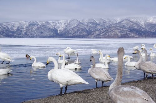 冬の屈斜路湖は渡り鳥のオオハクチョウが羽を休めることでも有名です。北海道の道東・阿寒国立公園にある屈斜路湖(くっしゃろこ)は、九州の阿蘇カルデラよりも大きい、東西約26km 南北約20kmと日本最大の「屈斜路カルデラ」の中にある日本最大のカルデラ湖…