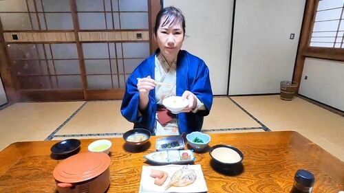 朝になりました☀直前まで寝ていたので顔がまだ寝てます(汗)じゃ~ん!こちらがとらや旅館の朝食です。 干物 と貝の味噌汁と温泉卵とご飯が並んでます。「これぞ温泉旅館の朝」という感じの朝食ですよね!しらす干しや大根おろし、納豆など、ご飯のお供が船…