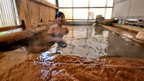 坂道を下ると、こちらが八町温泉共同浴場「亀の湯」です。ここに来るのは2回目で前回は雪の降る季節に来ました。バスタオル水着不可の温泉です。女性にはハードルが高いですねぇ。料金箱が柱に掛けられていますので協力金として300円入れました。亀の湯…