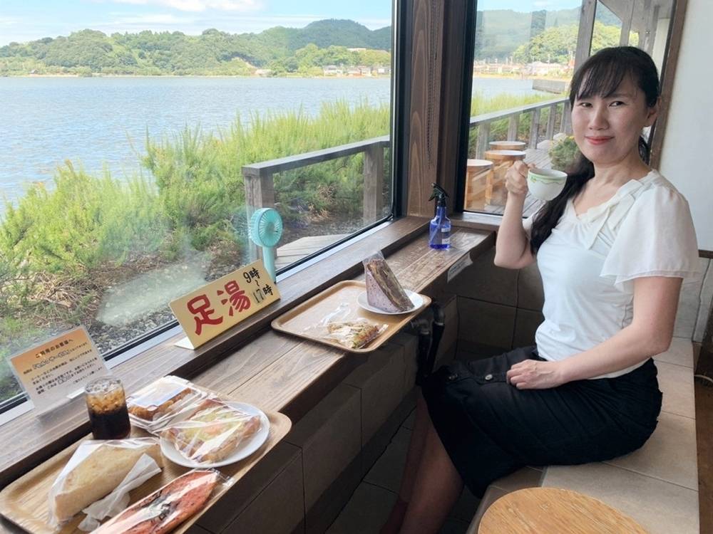 東郷湖を一望しながら足湯に浸かってパンを食べることができます。